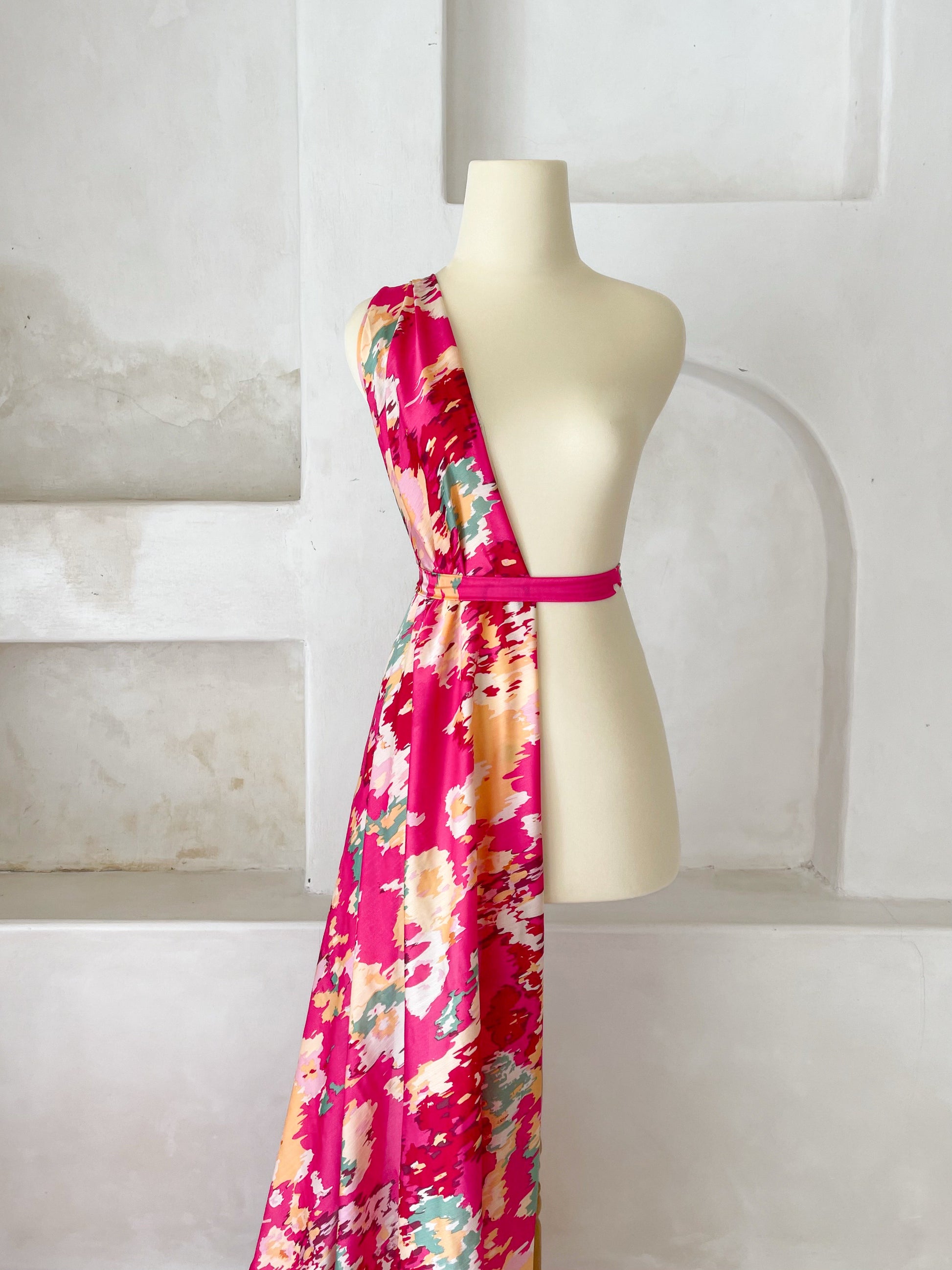 • Estampado: Abstracto multicolor sobre base fucsia, con tonos nude, verde y rojo