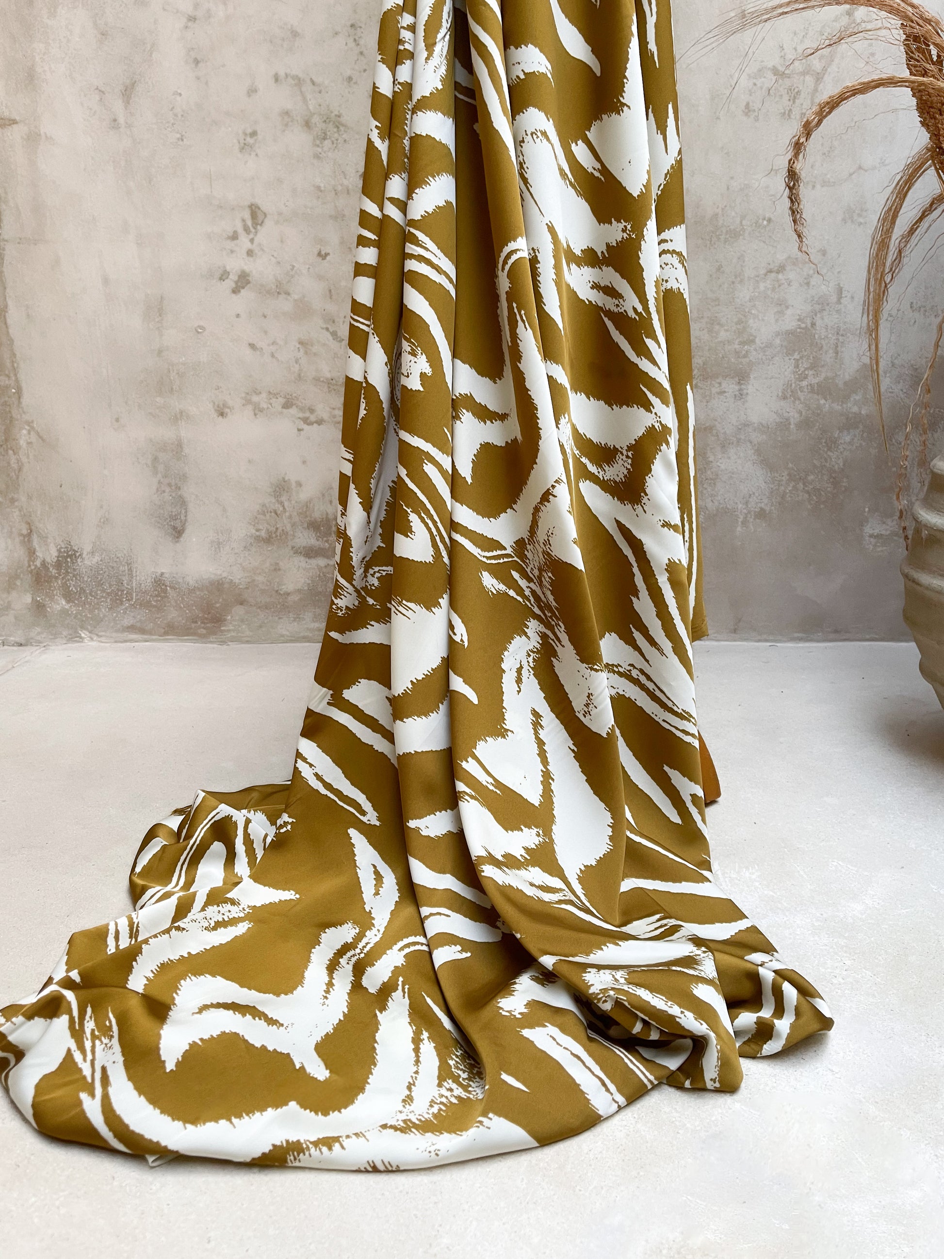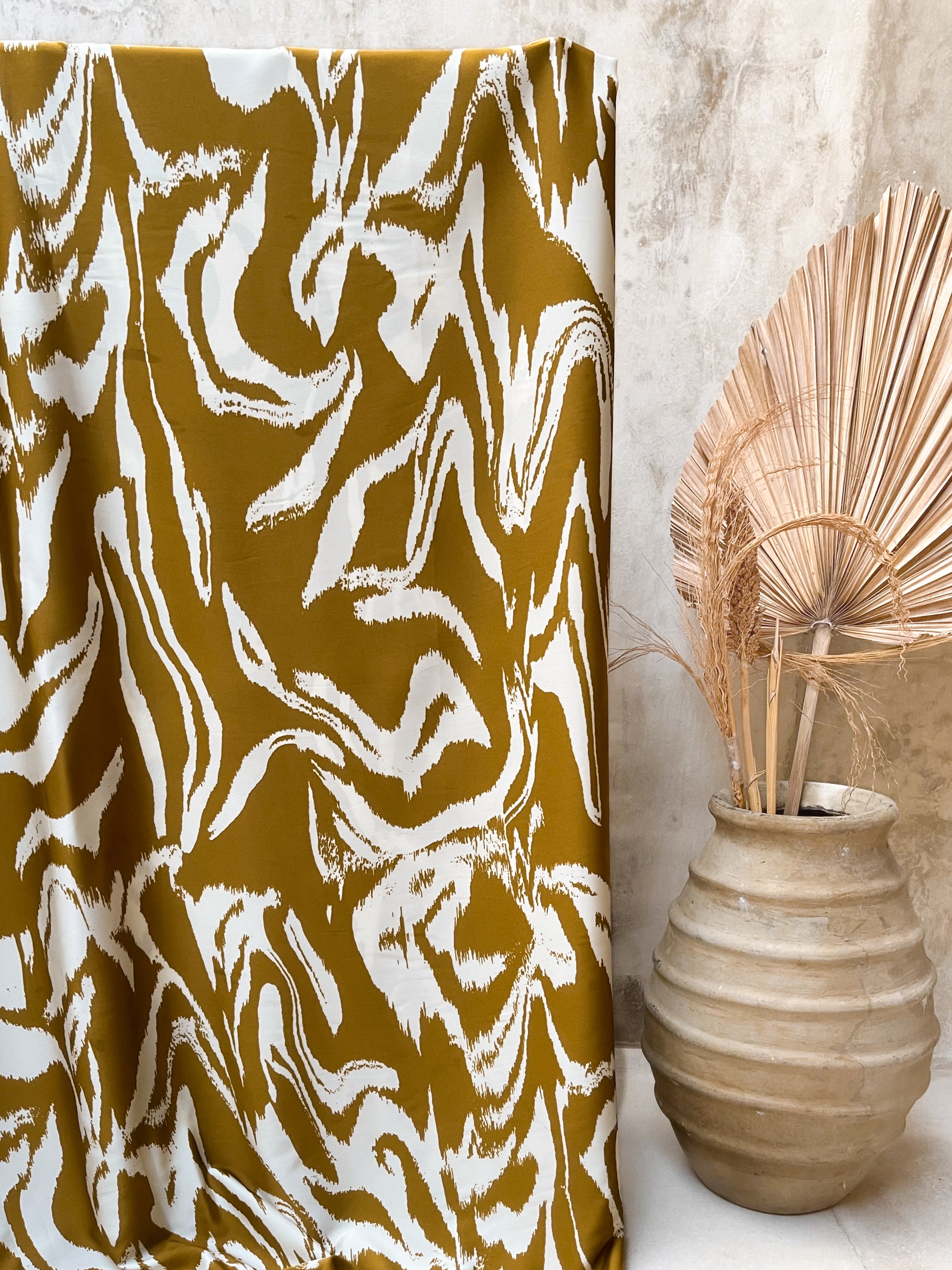 El diseño presenta un estampado artístico tipo pinceladas o mármol abstracto, en una combinación cálida y moderna de mostaza con blanco crudo. El contraste audaz y orgánico de las formas aporta carácter y sofisticación, ideal para prendas con identidad: desde vestidos y faldas amplias hasta pantalones fluidos o camisas de diseño.